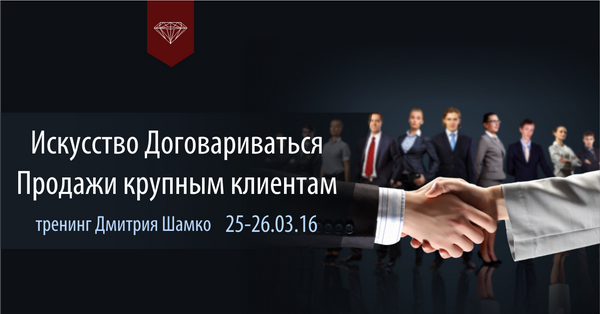 25 и 26 марта бизнес-тренер Дмитрия Шамко проведет тренинг «Искусство Договариваться. Продажи крупным клиентам ». Два дня тренинга посвящены освоению схемы результативной работы с клиентом и практическим тренировкам.